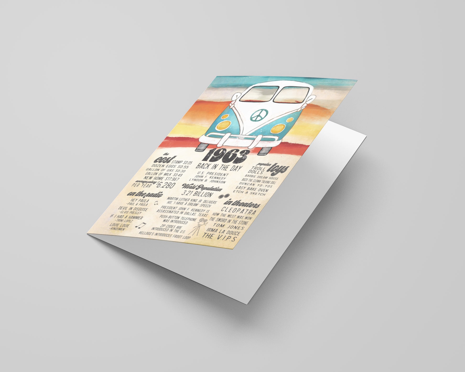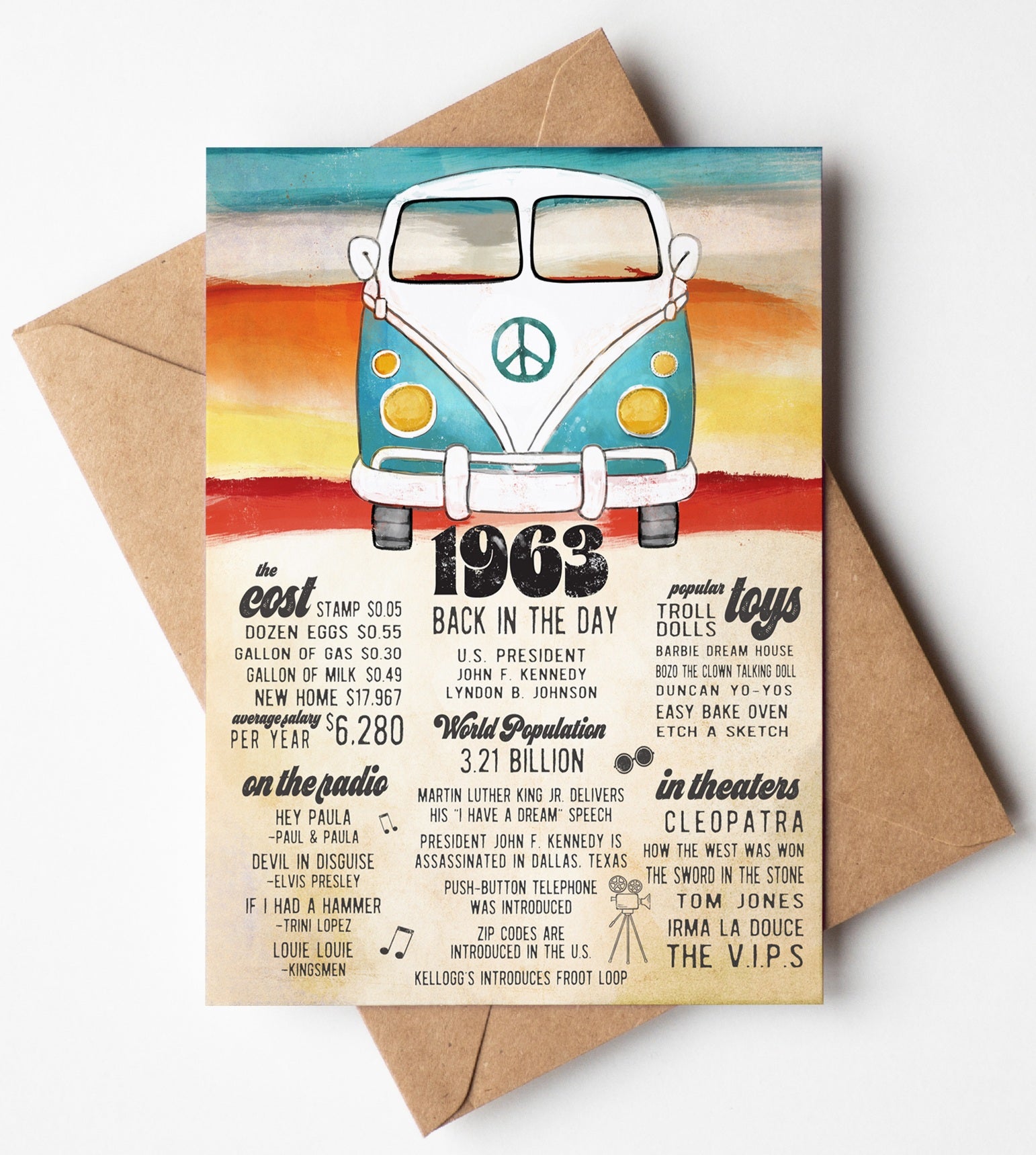 Our one-of-a-kind pop art-style birthday card is a thoughtful and unique gift, perfect for birthday gifts, anniversaries, or decorations. The 5x7 inch card features memorable facts about the year of birth or anniversary, and comes with a trendy kraft envelope. Add a special touch to the event with this unique, personalized card. Designed and made in the USA by Katie Doodle.